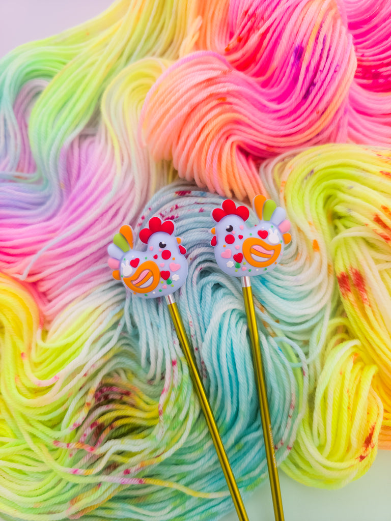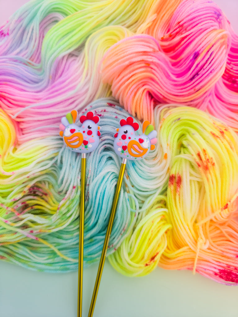 The Rainbow & Sprinkles Needle Stoppers are here to help keep your make safe! Slip 'em on the ends of your needles and rest easy knowing your stitches won't get away on you. Now you won't have to worry about finding the end of the needle every time you come back to your project. So grab a pair and get knitting!