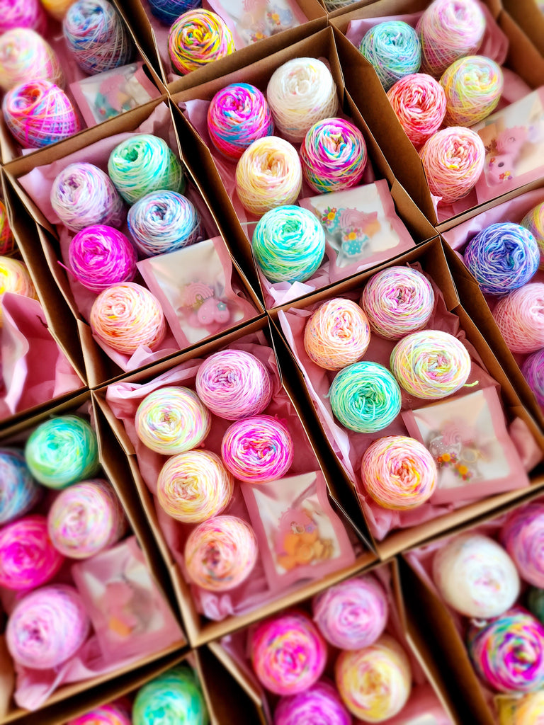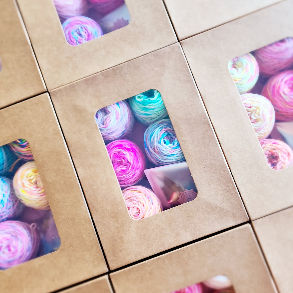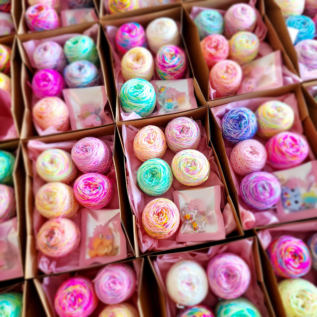 Discover the thrill of the unknown with our Mystery Mini Set! Each box contains a mix of mini colourways caked up ready to go, guaranteed to surprise and delight. Plus, you'll receive a set of needle stoppers and stitch markers to upgrade your knitting experience. Order now and let the excitement begin!